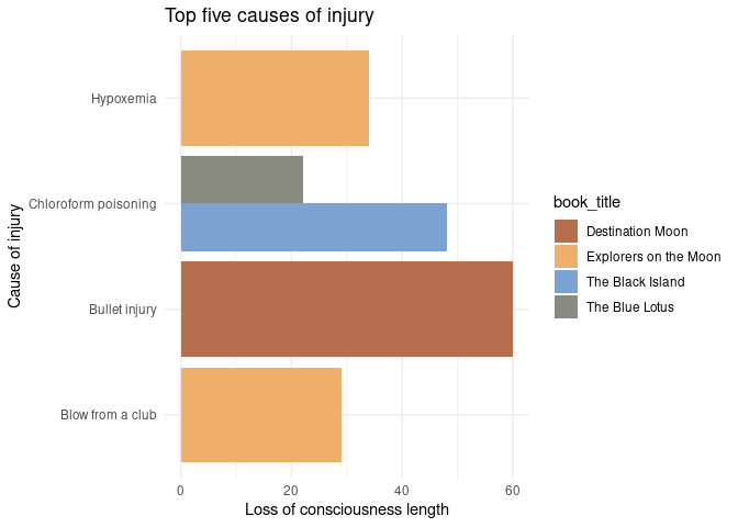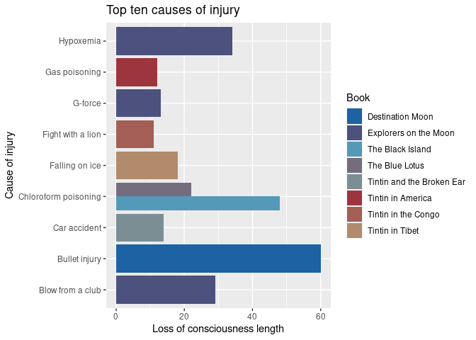 coord_flip()What happens if we need more colours than 5? The functions in the package can fix that. We’ll plot the top ten causes of injury.