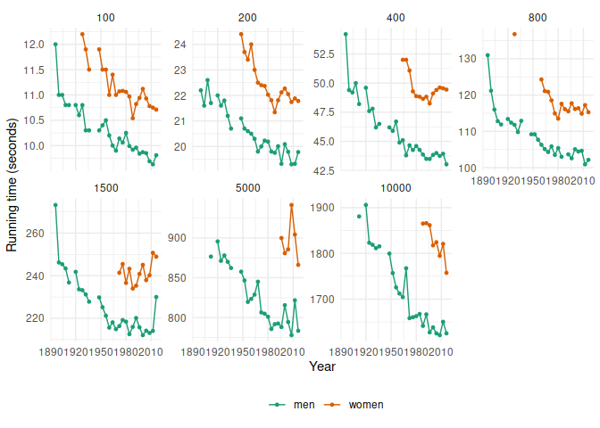 ggplot(olympic_running, aes(x=Year, y = Time, colour = Sex)) +