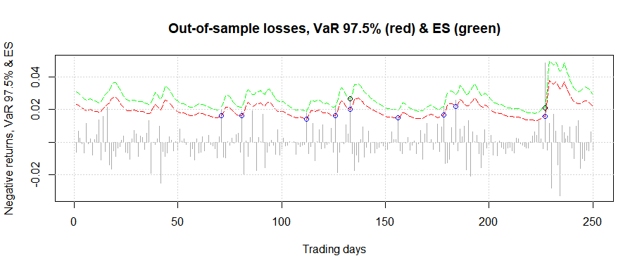 Plotting the out-of-sample loss series, VaR.e, ES & breaches: