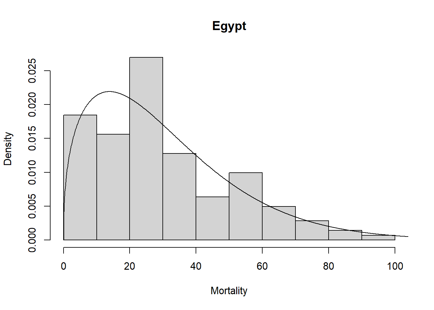 hist(egypt$age, freq = FALSE, xlab = "Mortality", main = "Egypt")