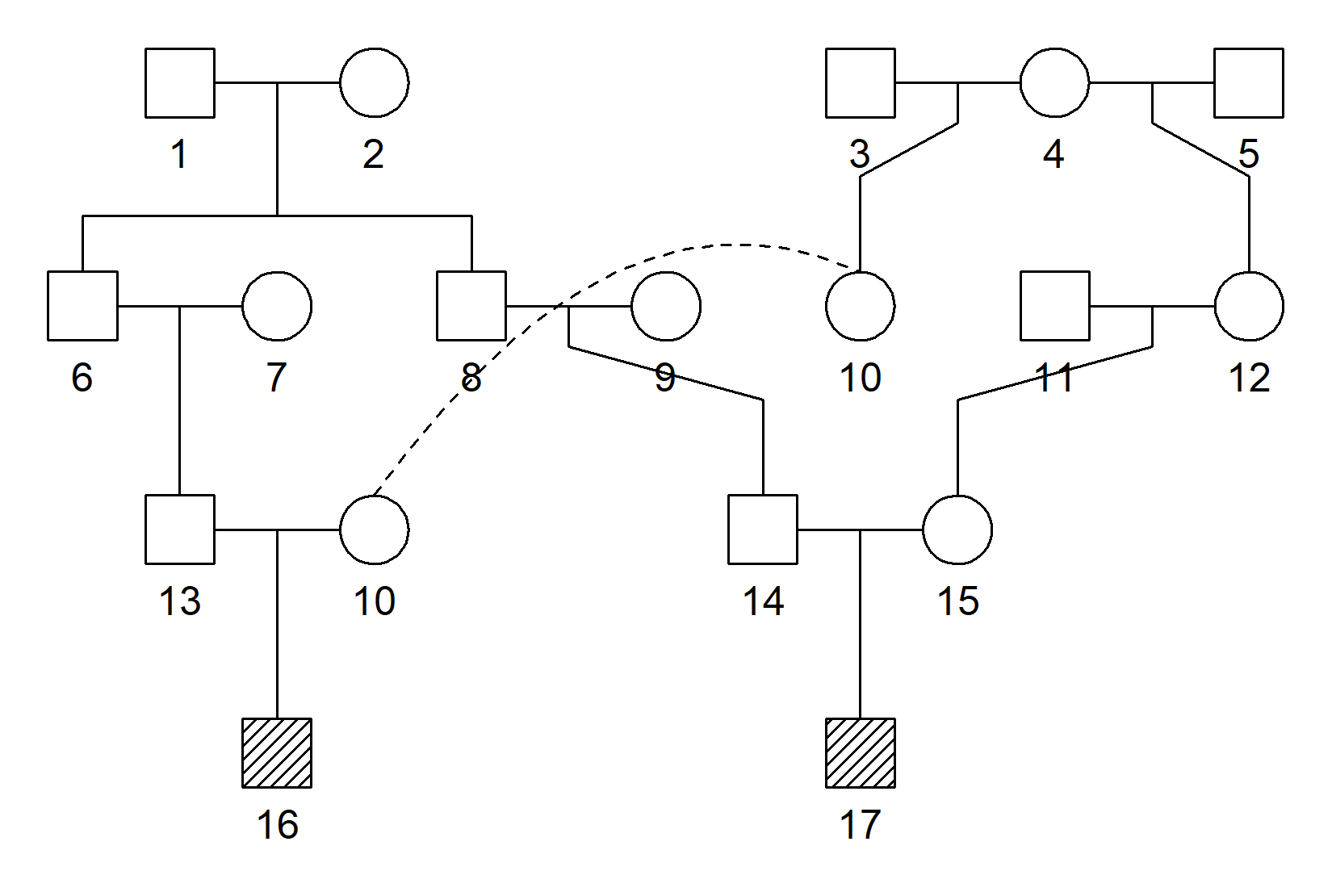 #> Loading required package: pedtoolsHere is an example involving a double-cousin-like relationship: