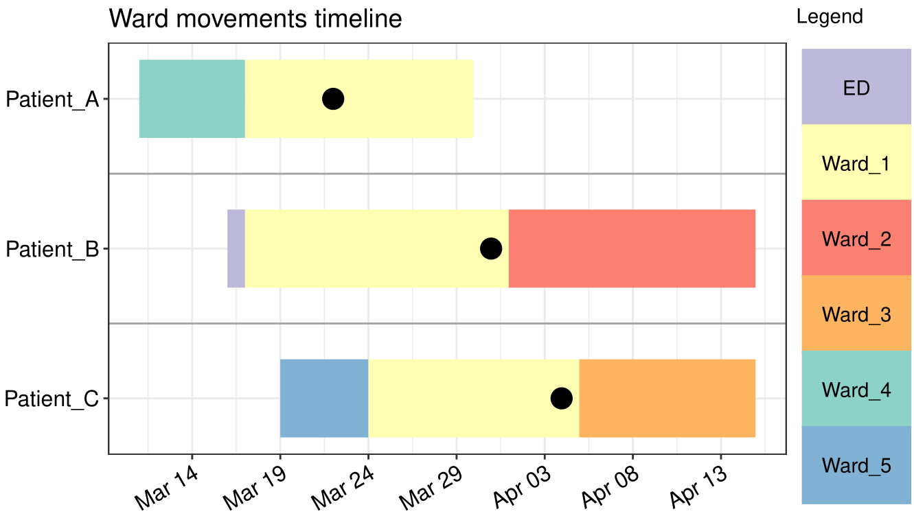 During COVID-19 2020, @wlhamilton used gg_vistime() for visualizing patient ward movements as timelines in order to investigate possible hospital acquired infections. See his github for the code.