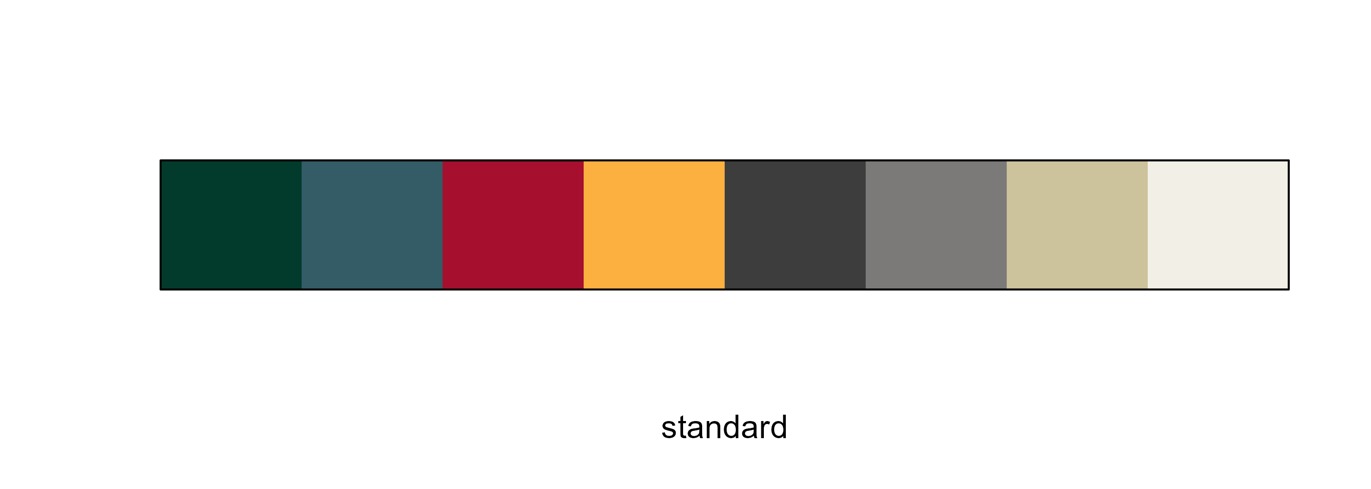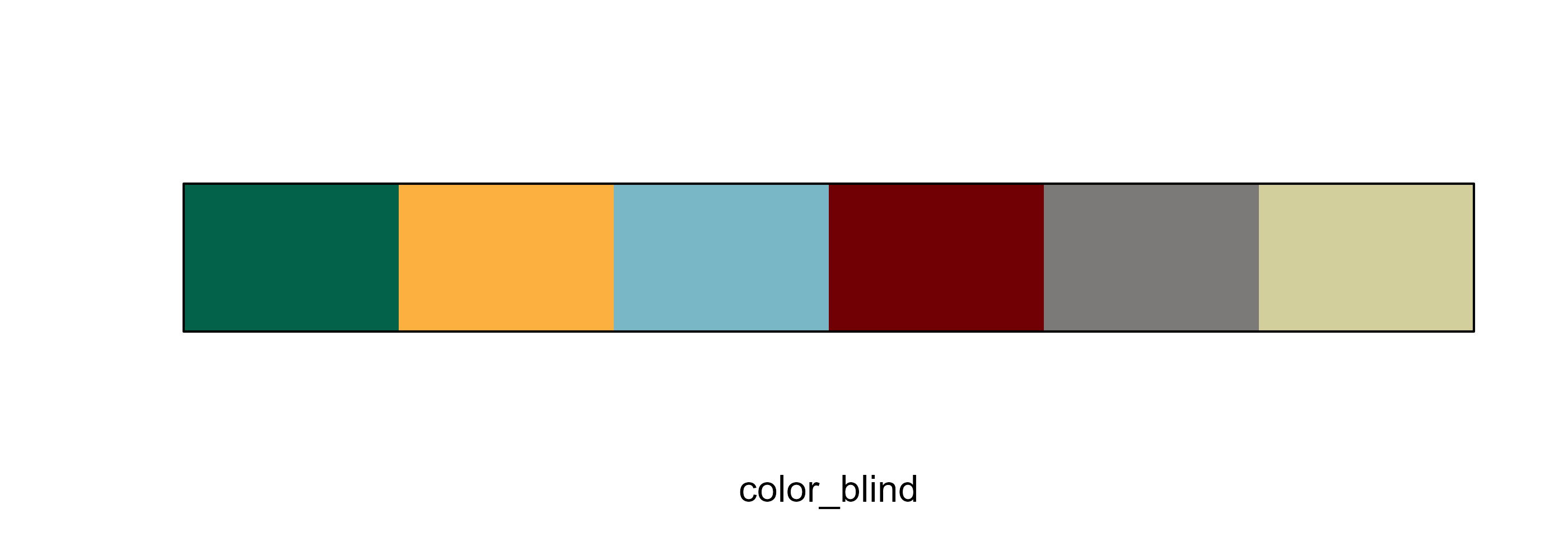 This palette is primarily to access individual brand colors for fonts, table headers, graphic backgrounds, etc. These colors, when used together in plots, are not accessible to those who may have color blindness.