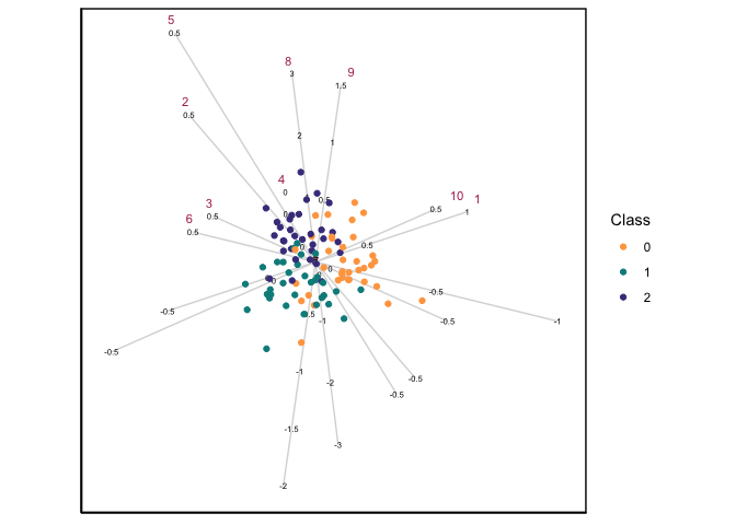 CVAbiplot(group.col=c("tan1","darkcyan","darkslateblue"),which.var = 1:10,zoom.out=80)
