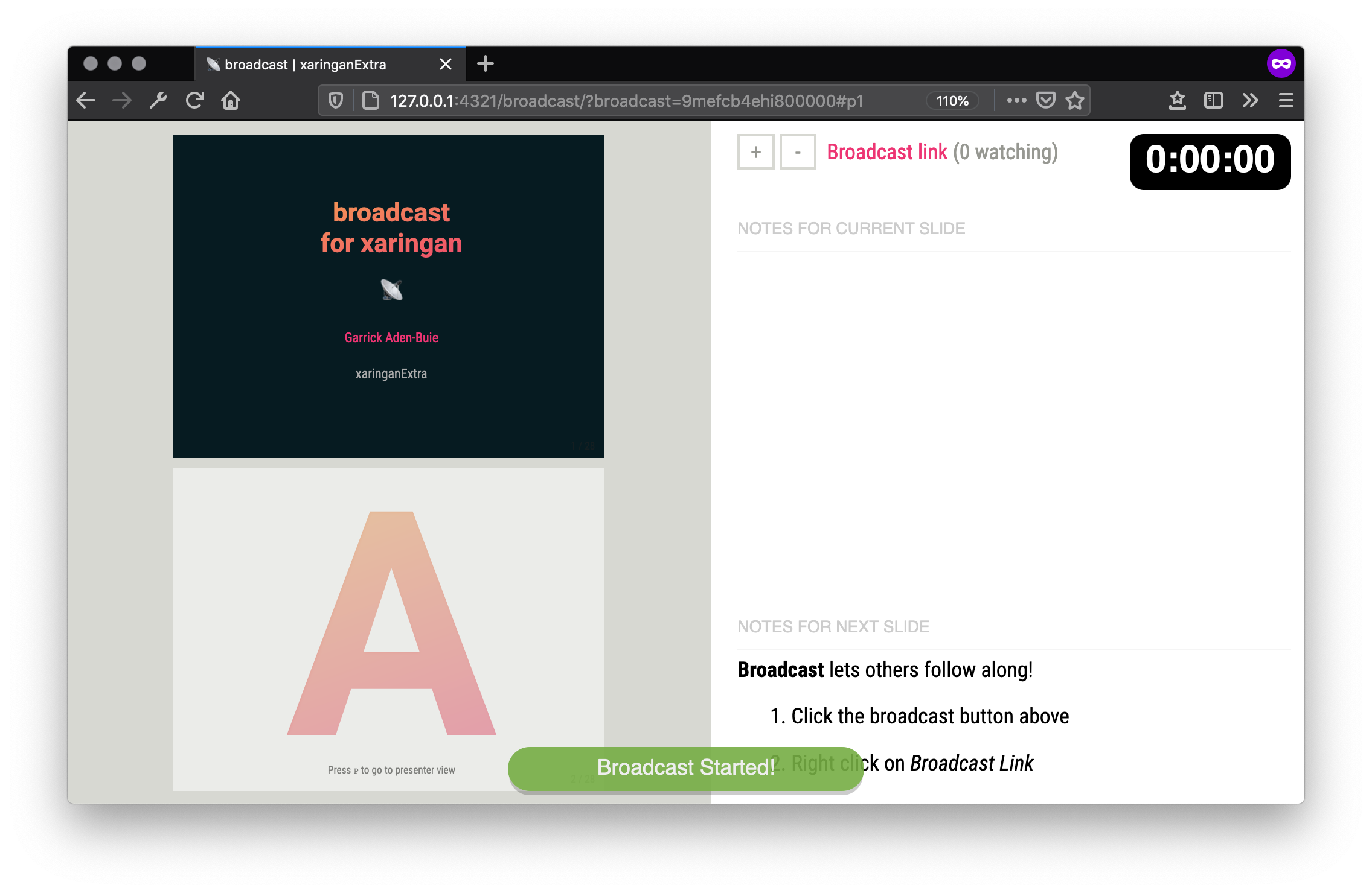 When you want to present, open the version of your slides hosted online in a modern browser. Then press P to enter the presenter view. Click on the Broadcast button to start broadcasting.